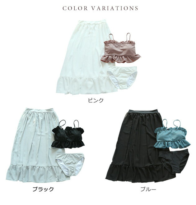 ⇒ 買い物ガイドはこちら商品説明 シフォンシアースカート付き ビキニ水着3点セット シャイニーな煌めきのある素材が特徴のビキニです。