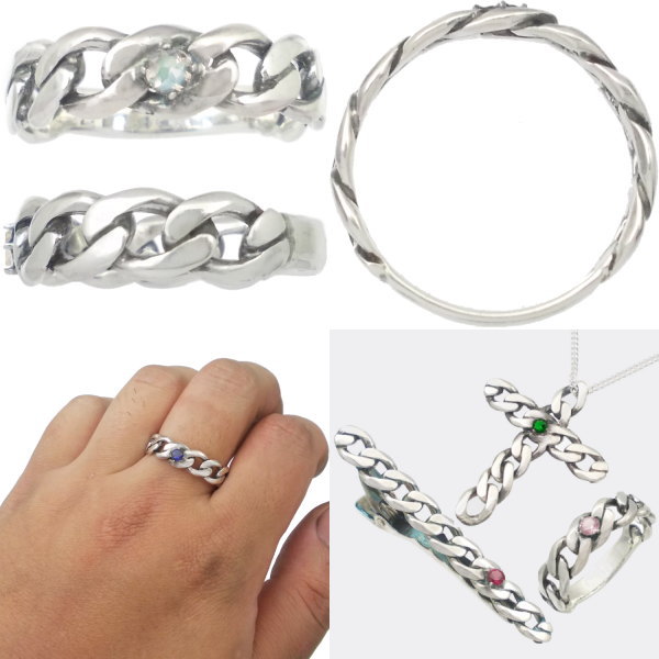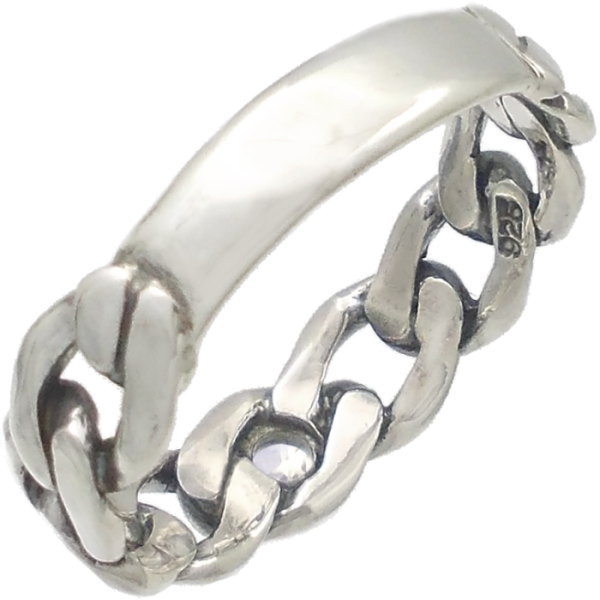 (最大幅7mm最小幅4.5mm、最大厚3mm、13-27号)キヘイチェーン柄ではなくチェーンを直接ロウ付けして繋ぎ合わせた敢えて手間を加えたアナログ感が魅力。
