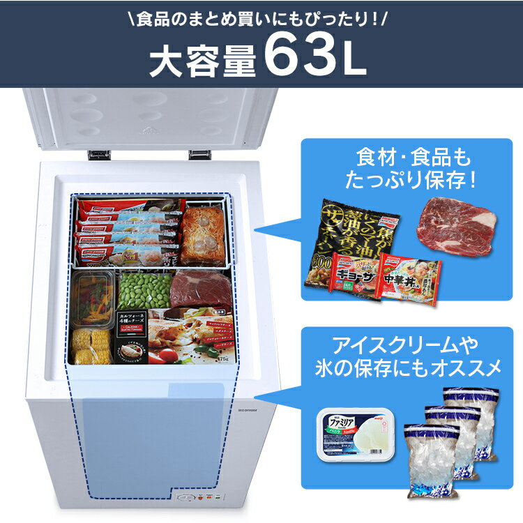 “冷凍庫があれば、生活がより便利に”◆食品のまとめ買いにもぴったり!大容量63L買い物カゴ約2個分が入ります!◆バスケット付き食品を仕分けできるバスケット付き。