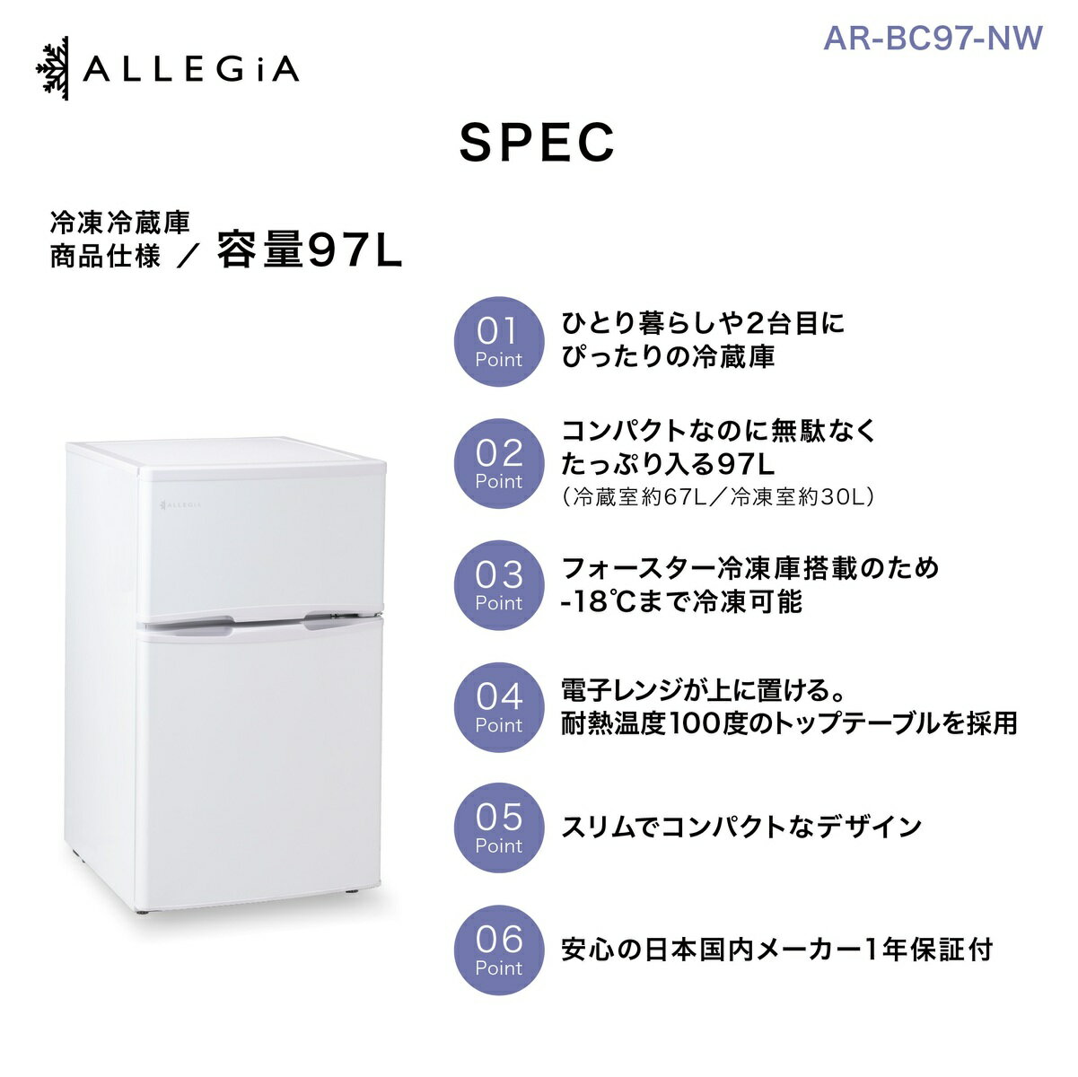 商品情報種類電気冷凍庫 冷気自然対流方式(直冷式)定格内容積97L/リットル(冷凍室30L/冷蔵室67L)商品サイズ約 W477mm X D557mm X T838mm※W(幅)×D(奥行)×T(高さ)梱包サイズ約 W522mm X D583mm X T881mm※W(幅)×D(奥行)×T(高さ)質量約 28kg電源コード2.0m気候/CLIMATEクラス:SN/N/ST定格電圧AC100V定格電流0.75/0.75A (50/60)定格周波数50 / 60Hz定格消費電力量70 / 70W運転音28db冷媒R600a / 31g年間消費電力量236 / 228kWh / 年 (JIS C 9801-3:2015)付属品取扱説明書/保証書/霜取りヘラ/製氷皿/野菜容器/野菜容器棚/蒸発皿/アイスボックス/冷蔵室棚冷蔵庫 小型 ひとり暮らし 97L 2ドア ミニ冷蔵庫 おしゃれ 前開き 右開き スリム 小型冷蔵庫 静音 冷凍 一人暮らし 寝室 新生活 ギフト ホワイト 備蓄 まとめ買い 冷凍食品 AR-BC97-NW アレジア ALLEGiA 冷蔵庫 キッチン キッチン家電 作り置き おかず 静音 寝室 リビング コンパクトなのに大容量 サブとして2台持ち プレゼント 食品の大量ストックにおすすめ まとめ買い 【メーカー保証1年付】シンプルなデザインが人気の2ドア冷凍冷蔵庫。