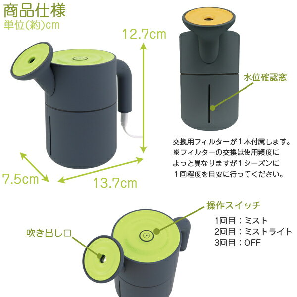 サイズ 外寸(約)幅13.7×奥行7.5×高さ12.7cm ボトル容量:(約)320ml 素材・材質 ABS樹脂・ポリプロピレン・シリコン 電源 USB電力供給式 重量 (約)175g 加湿方式/噴霧量 超音波式 (約)40ml/1時間あたり 稼動時間 (約)5時間(水がなくなると運転停止となります) 付属品 電力供給用USBケーブル×1 替え芯×1 キーワード デスクトップ ジョウロ型 じょうろ型 コンパクト スマート 加湿器 卓上 おしゃれ LED インテリア 癒し 超音波式 USB 睡眠 オフィス 寝室 グリーン 90032 545265 イエロー 90033 545272 201910-05