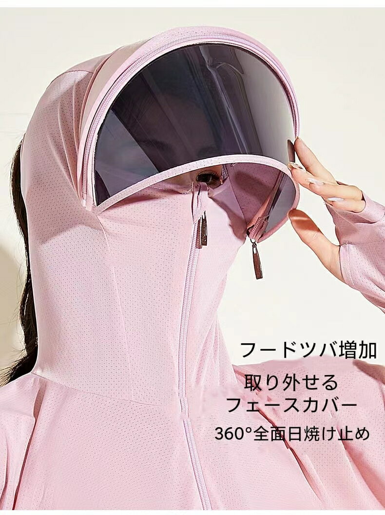 フェスカバーとフード付きですので、首元までしっかり紫外線から守れ、さらに袖丈やや長めデザインロングスリーブタイプで手首もしっかりと覆えます!!UVカット率も安心の「全カラーUV遮蔽率99%以上」長く外出しなくてはいけない時も、紫外線から肌をしっかり守ります!。