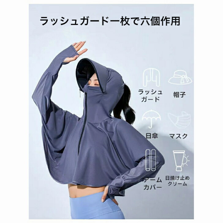 ラッシュガード レディース ケープ 接触冷感 ひんやり 吸水速乾 ラッシュパーカー 水陸両用 UVカット 薄手 UPF50 長袖 指穴 フード ツバ取り外し 髪出ホール UVパーカー 体型カバー 通気性抜群 ストレッチ素材 サイズ大きめ 日焼け 紫外線対策 UVカット率99%以上 360°カバー しっかりカバーできる薄手の冷感素材 パーカー 1