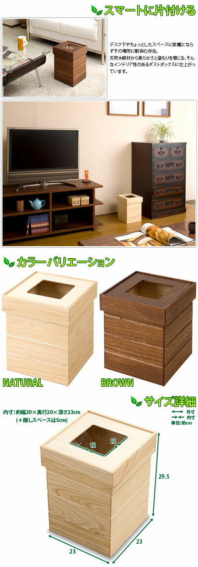 ■商品仕様本体:天然木桐材(ウレタン樹脂塗装)天板:天然木桐化粧板(ウレタン樹脂塗装)底板・中仕切り板:MDF原産国:日本製商品重量:800g■商品サイズ本体:(約)幅23×奥行23×高さ29.5cm内寸:(約)幅20×奥行20×深さ23(+隠しスペースは5)cmゴミ入れ口:(約)幅12×奥行12cm■注意事項組み立て完成品備考商品画像は色合いや素材感が実際の商品と異なる場合がございます。