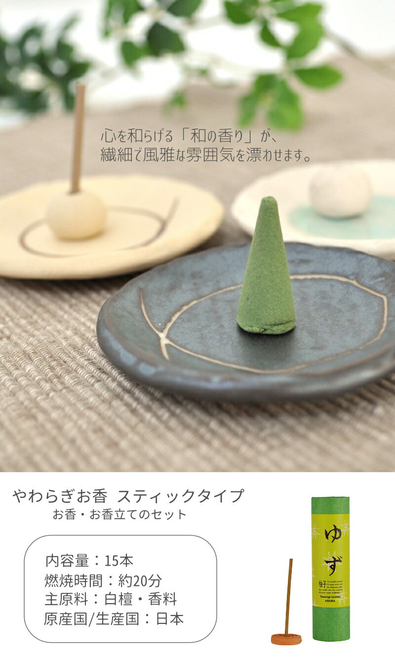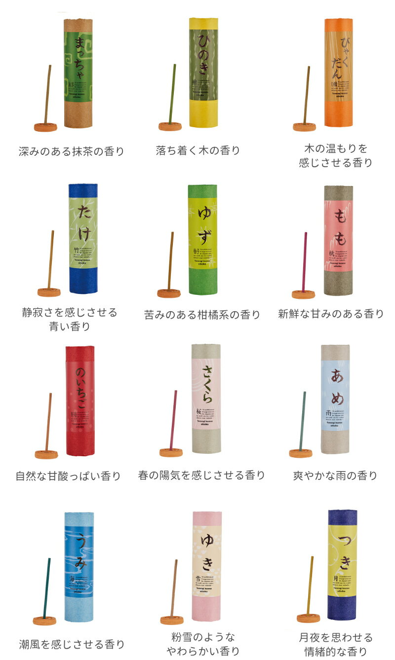 商品詳細 ■商品名 和(やわらぎ)お香 スティックタイプ ■内容量/燃焼時間 15本/約20分 ■サイズ Φ30mm×H115mm ■生産国 日本 ■主原料 白檀、香料 ■製品コード 001-02-001~001-02-011 ■使用上の注意 ●エッセンシャルオイルを使っているので、商品によっては火がつきにくいことがあります。